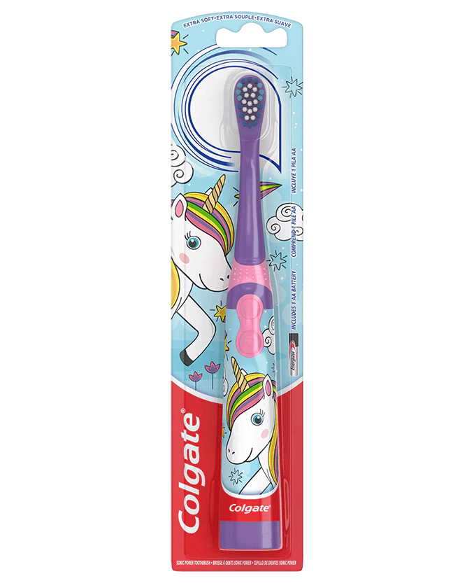 The Colgate Kids Battery Toothbrush provides a great clean made fun. Made for ages 3 and up, this kids battery toothbrush was designed with a slim, easy-to-hold handle to let them do the brushing, while the vibrating brush head does all the work. Its small, vibrating head has extra soft bristles that are gentle on delicate gums while cleaning teeth and sweeping away plaque. This soft toothbrush for kids is battery-powered, so it’s easy to replace the battery wherever you are