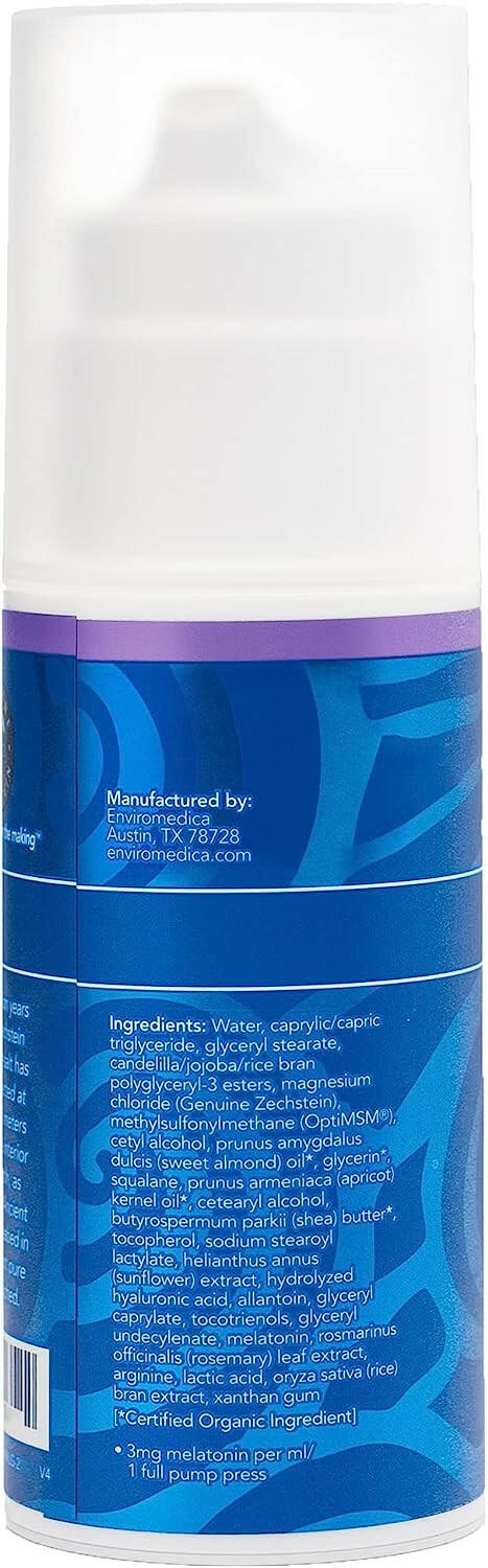Ancient Minerals Magnesium Lotion with Melatonin is a smooth, quickly absorbed emulsion of magnesium chloride and melatonin in a skin-nourishing base of certified organic oils. Ancient Minerals is fragrance free and does not contain any formaldehyde releasing preservatives.
