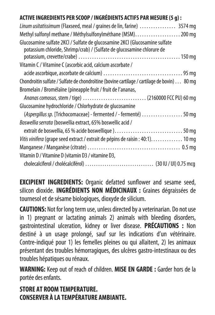 Supplying 200 mg of MSM, 200 mg of glucosamine complex (sulfate, hydrochloride) and 80 mg of chondroitin per 5 g scoop (used for each 20 lb of animal’s body weight), BioJOINT contains a blend of powerful antioxidants, vitamins and herbs that facilitate a healthy inflammatory response and support healthy joint function.