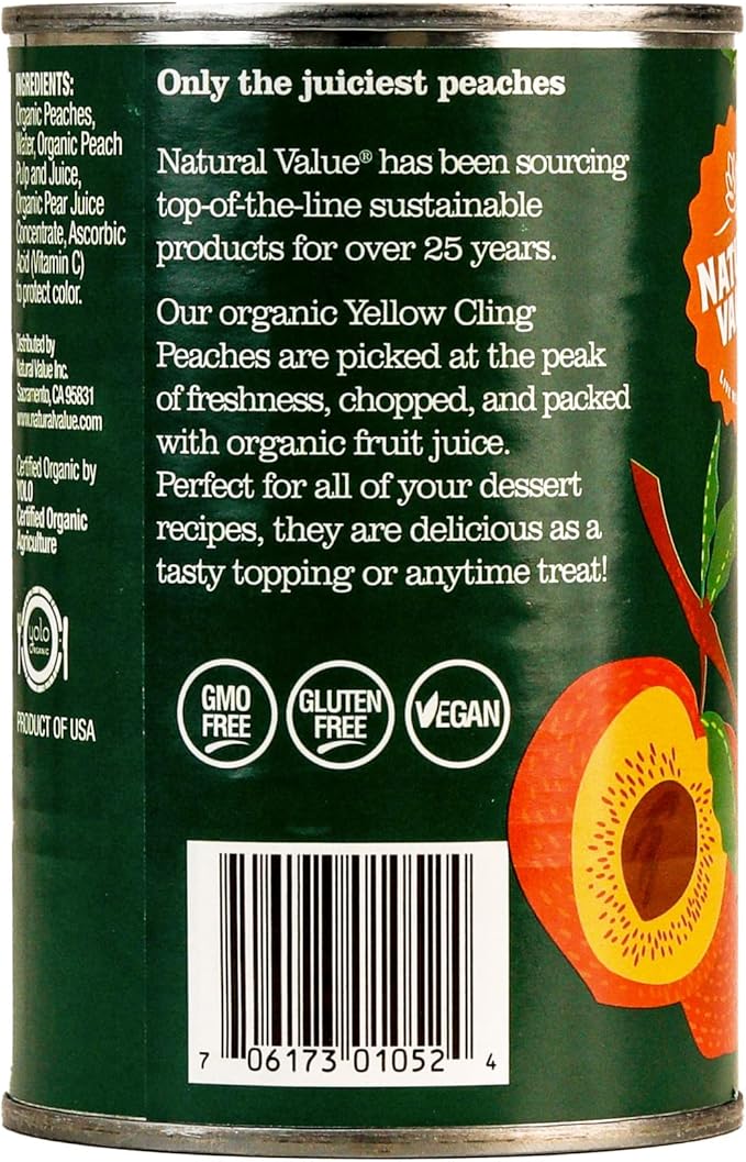 Natural Value's organic yellow cling peaches are picked at the peak of freshness, chopped, and packed with organic fruit juice. Perfect for all of your dessert recipes, they are delicious as a tasty topping or anytime treat!.